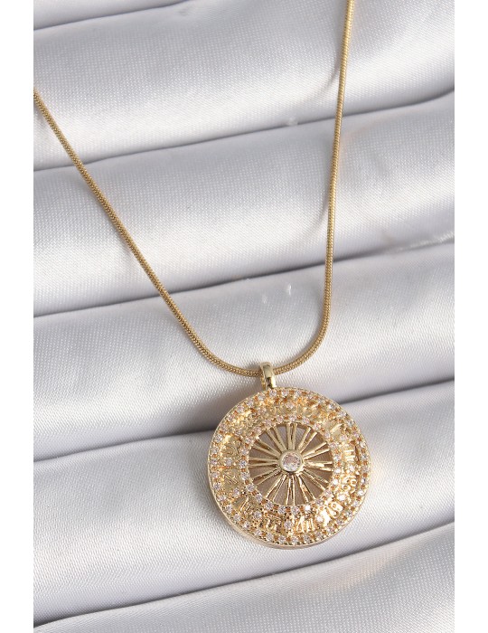 316L Çelik Gold Renk Zirkon Taşlı 12 Burç Madalyon Model Kadın Kolye - TJ-BKO9542