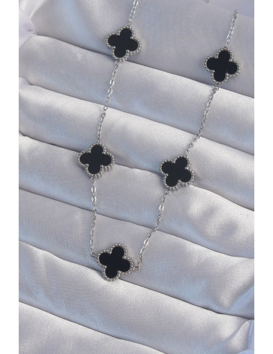 316L Çelik Gümüş Renk Siyah Mineli Yonca Kolye - TJ-BKO8997