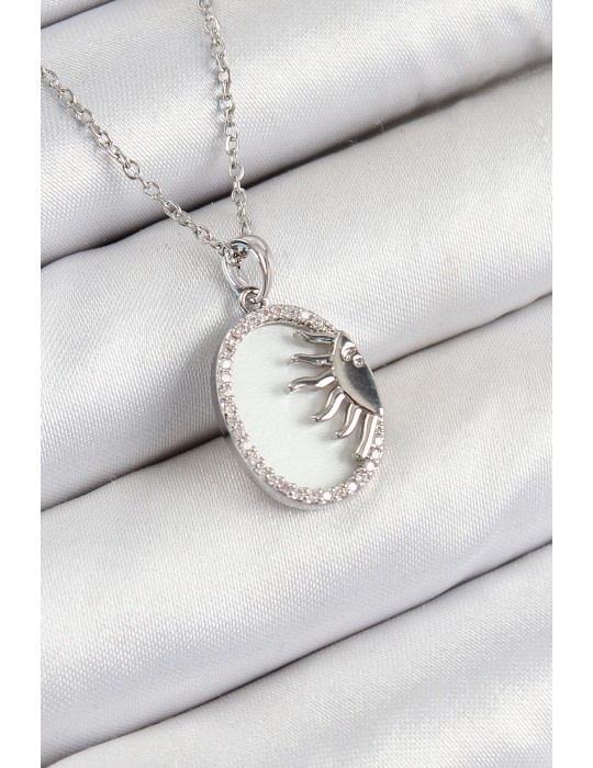 316L Çelik Zirkon Taşlı Yarım Güneş Model Gümüş Renk Kadın Kolye - TJ-BKO10344