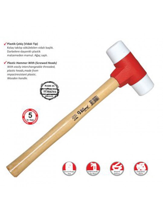 Malzeme: Çekicin baş kısmı, darbelere dayanıklı ve yüzeylere zarar vermeyen yüksek kaliteli sert plastikten üretilmiştir. Sap kısmı ise doğal ahşap malzemeden yapılmış olup, ergonomik tasarımı sayesinde rahat bir tutuş sağlar.